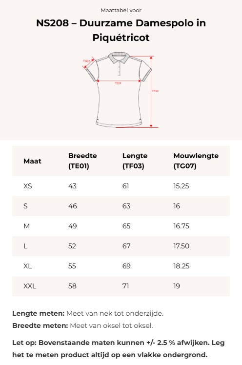 | Beschikbare maten | XS | S | M | L | XL | XL | XXL |